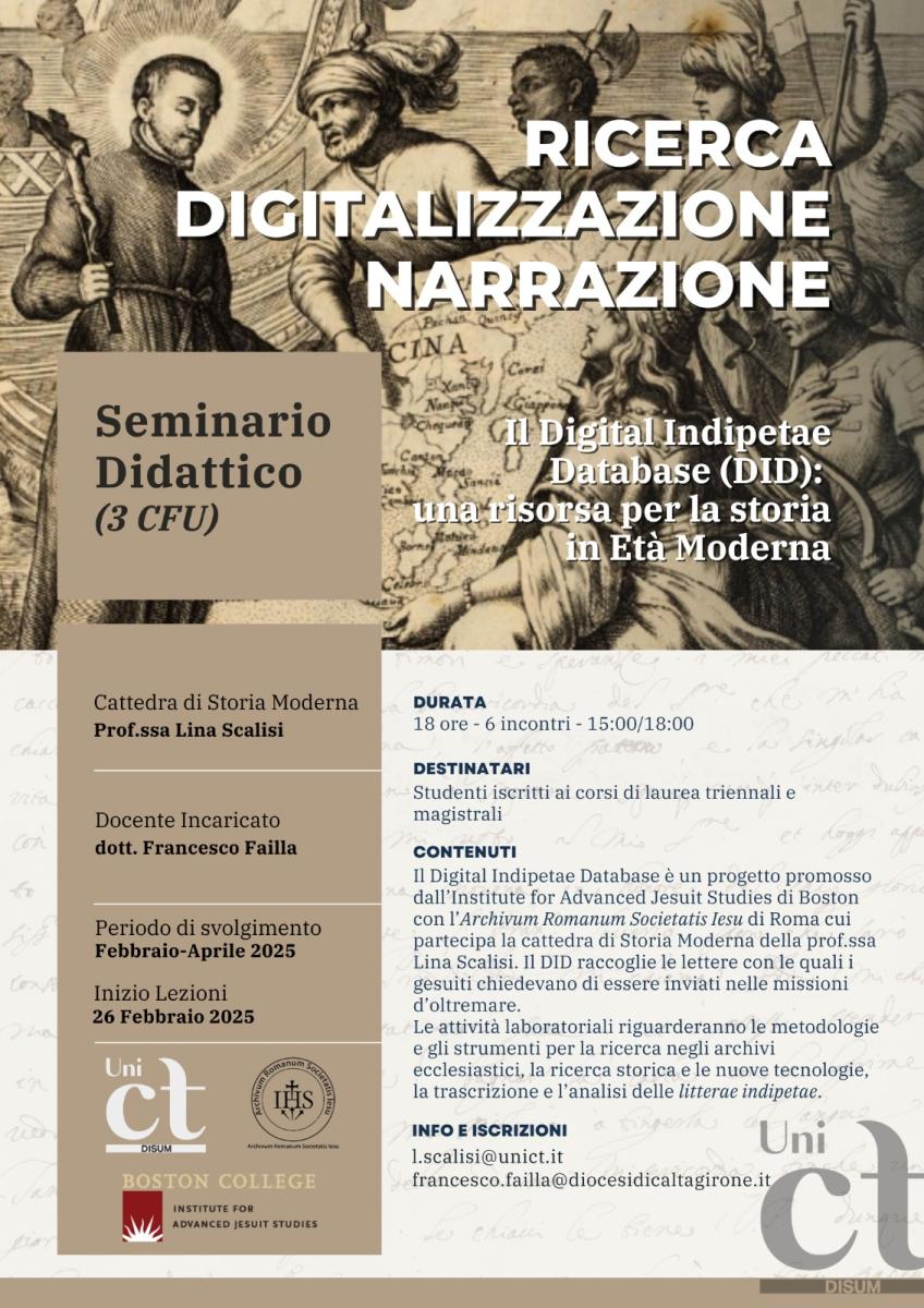 Sono aperte le iscrizioni al seminario didattico "Ricerca, digitalizzazione, narrazione - Il Digital Indipetae Database (DID), una risorsa per la storia in Età Moderna", promosso dalla cattedra di Storia Moderna (prof.ssa Lina Scalisi) del Dipartimento di Scienze umanistiche, in collaborazione con l’Institute for Advaced Jesuit Studies di Boston, l’Archivum Romanum Societatis Iesu di Roma.