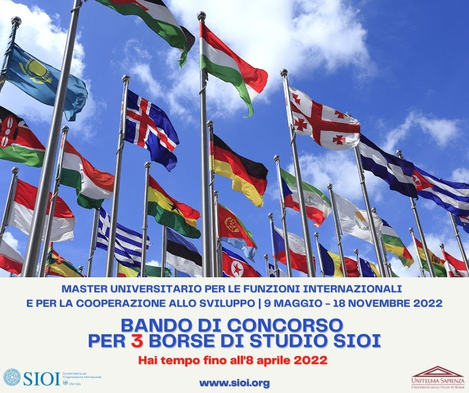 La Società Italiana per l’Organizzazione Internazionale (SIOI) ha pubblicato un bando di concorso per l’erogazione di tre borse di studio finalizzate alla partecipazione al master universitario per le Funzioni Internazionali e per la Cooperazione allo Sviluppo, che si svolgerà in modalità blended dal 9 maggio al 18 novembre 2022.