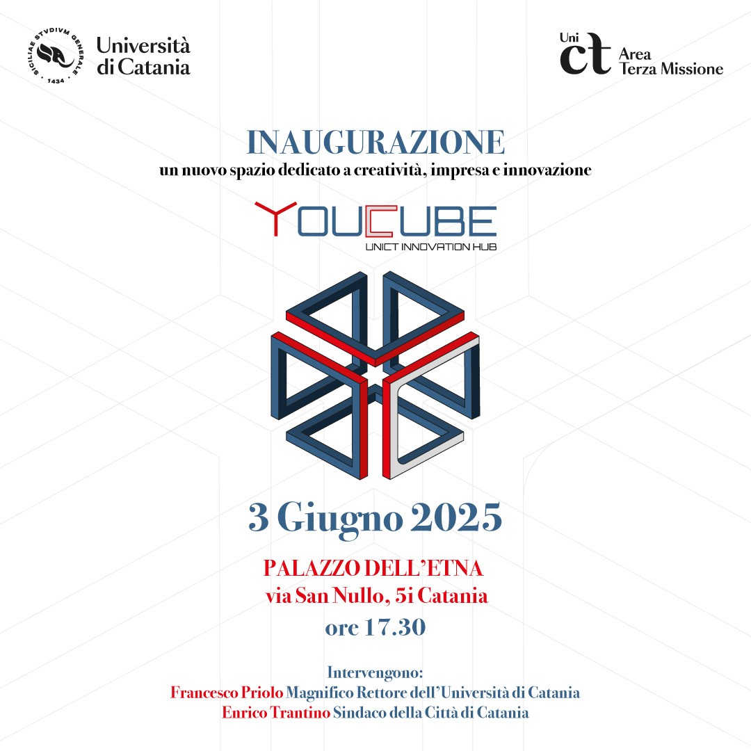 A partire dalle 17:30, l’evento si concluderà con l’inaugurazione ufficiale del nuovo incubatore “YouCUBE”, uno spazio dedicato al coworking e all’accompagnamento di nuove idee imprenditoriali. Saranno presenti il Rettore Francesco Priolo e il Sindaco di Catania Enrico Trantino.