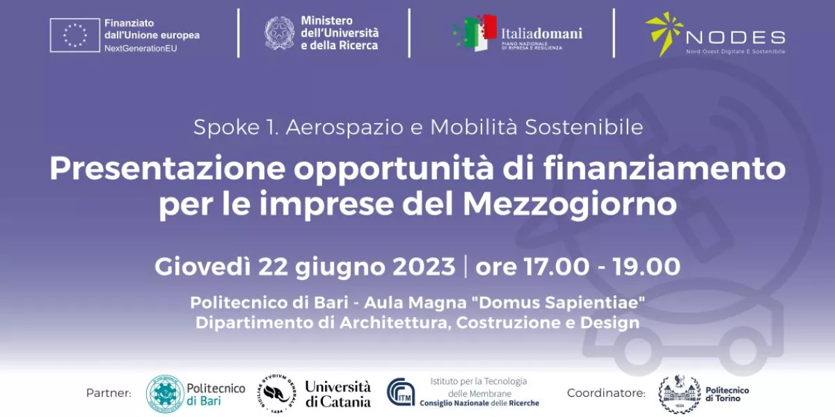 graficaGiovedì 22 giugno, nell’aula magna “Domus Sapientiae” del Politecnico di Bari (Dipartimento di Architettura, Costruzione e Design), si terrà l’evento di presentazione dei bandi di finanziamento e delle opportunità per le imprese organizzato dallo Spoke 1 dell’Ecosistema "NODES – Nord Ovest Digitale e Sostenibile", dedicato a Aerospazio e Mobilità sostenibile.