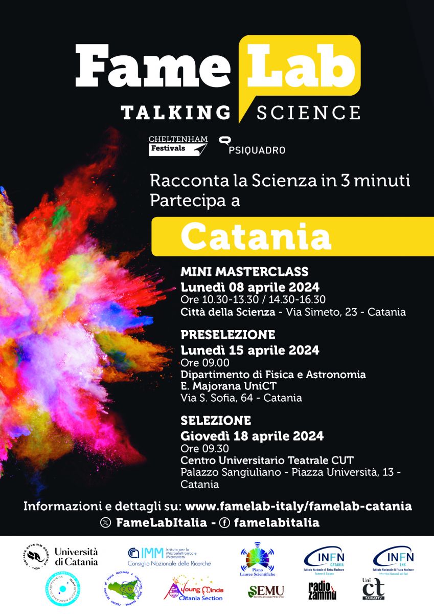 Lunedì 8 aprile, dalle 9:30 alle 16, a Città della Scienza (Via Simeto 23 - Catania), tutte le persone interessate ad iscriversi alle pre-selezioni FameLab di Catania, potranno partecipare all'incontro gratuito dal titolo “Comunicare la ricerca attraverso la parola. Teoria e pratica del talk breve”.